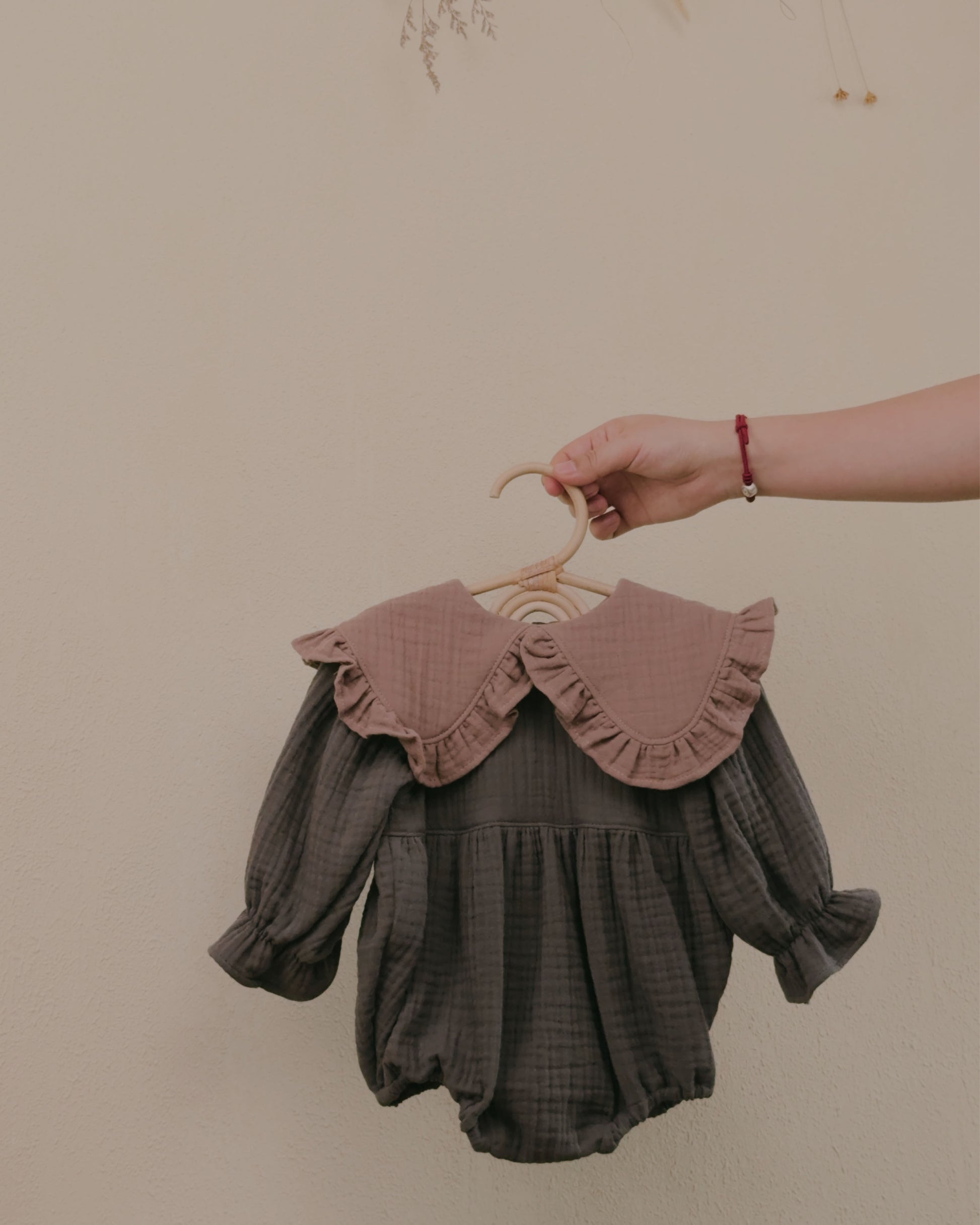The soft cream body pairs with a playful mustard ruffle collar — a color combination carefully chosen to stand out from everyday basics. The ruffled cuffs add a sweet touch, while coconut buttons at the back make dressing simple. Snaps at the crotch allow quick diaper changes, so it’s not only beautiful but also practical.