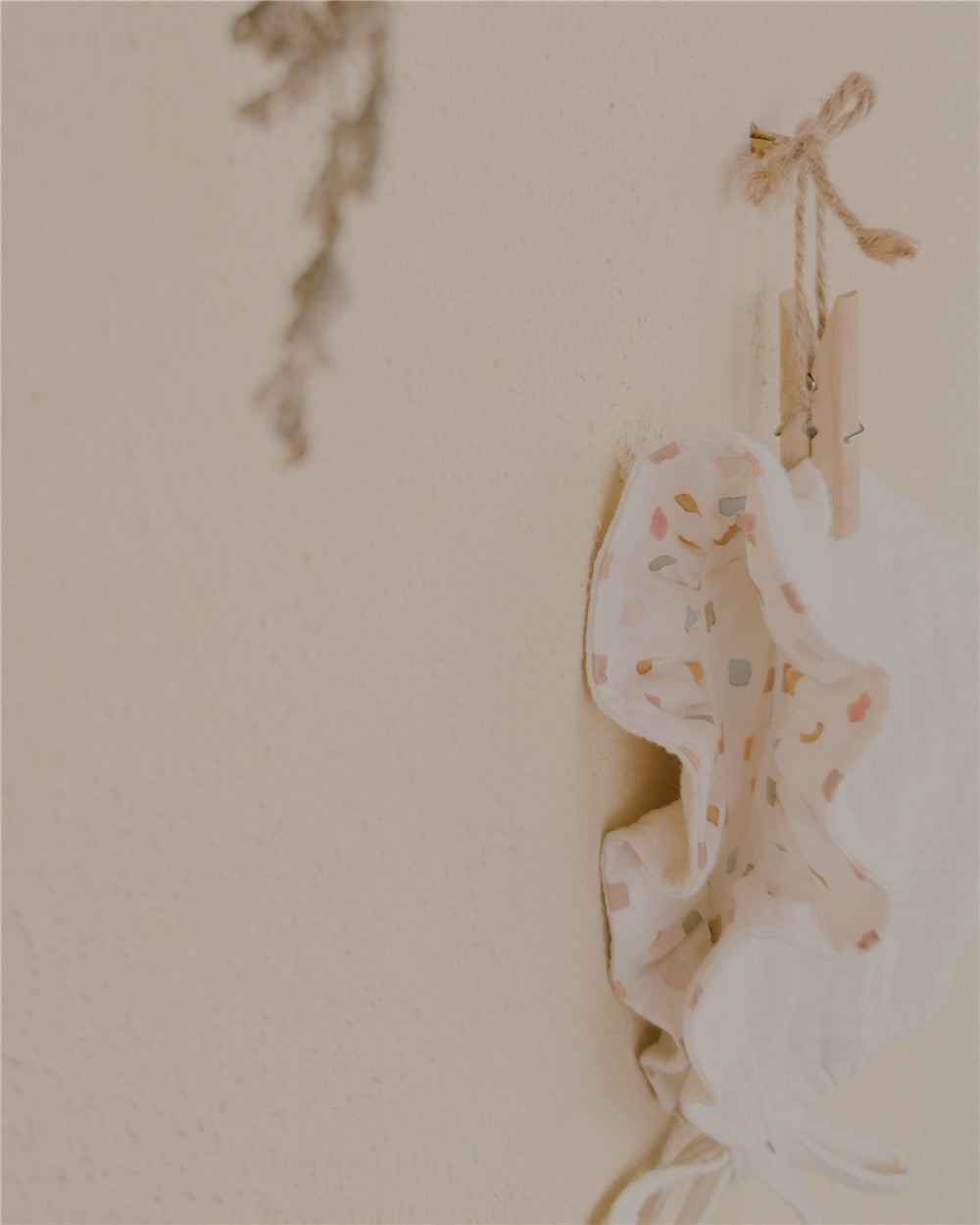 The brim offers a gentle shade for sunny walks, while the gathered silhouette keeps your baby’s head cozy without overheating. The cotton ties are soft and secure, allowing you to fasten it gently under the chin.