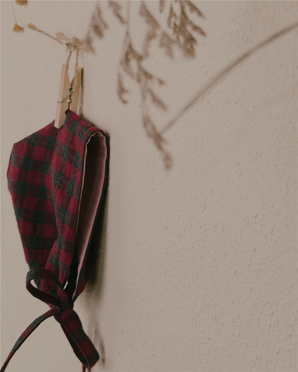 ♥ A soft, festive bonnet for cozy days — gentle inside, gingham outside.