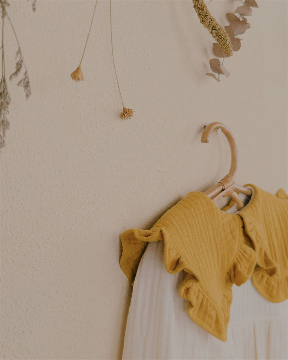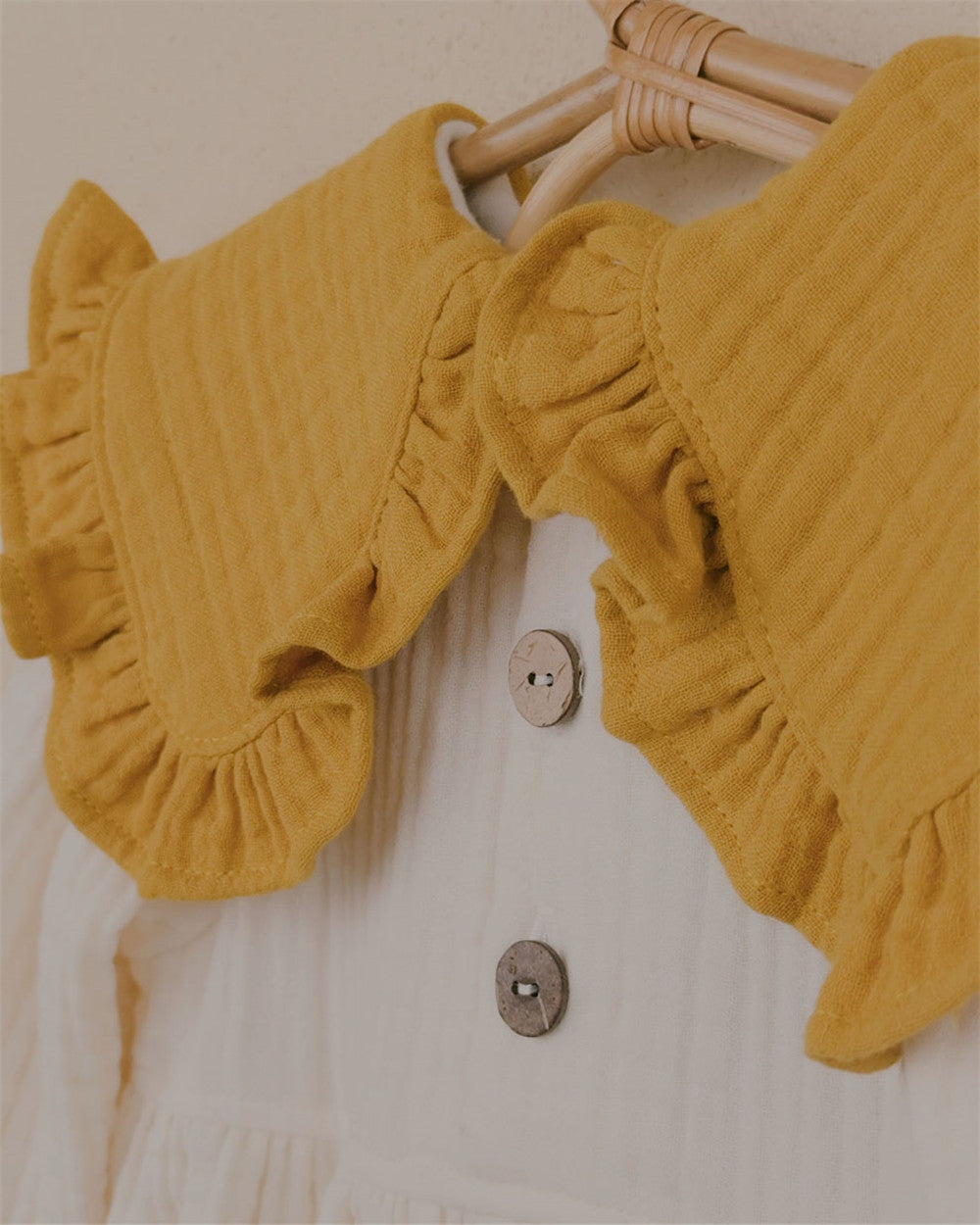 The soft cream body pairs with a playful mustard ruffle collar — a color combination carefully chosen to stand out from everyday basics. The ruffled cuffs add a sweet touch, while coconut buttons at the back make dressing simple. Snaps at the crotch allow quick diaper changes, so it’s not only beautiful but also practical.