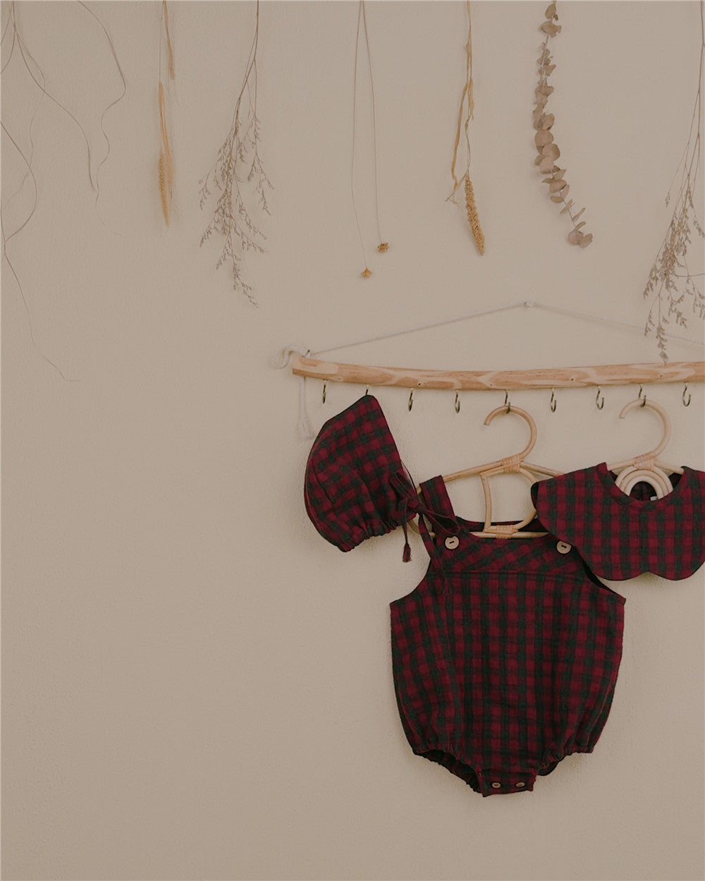 This green gingham romper is crafted from double-layer cotton gauze, giving it a breathable yet cozy feel. It moves lightly, perfect for warm days on its own — or layered over a soft tee when the air turns cool.